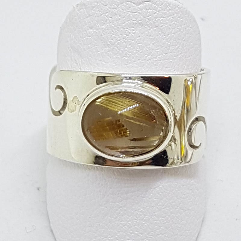 Sterling Silver Oval Rutilated Quartz in Wide Band Ring with Wave Design