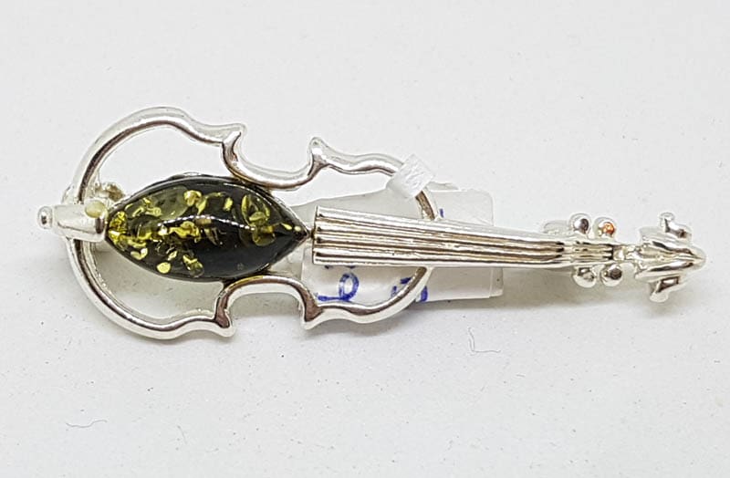 Sterling Silver Natural Amber Green Violin Musical Brooch