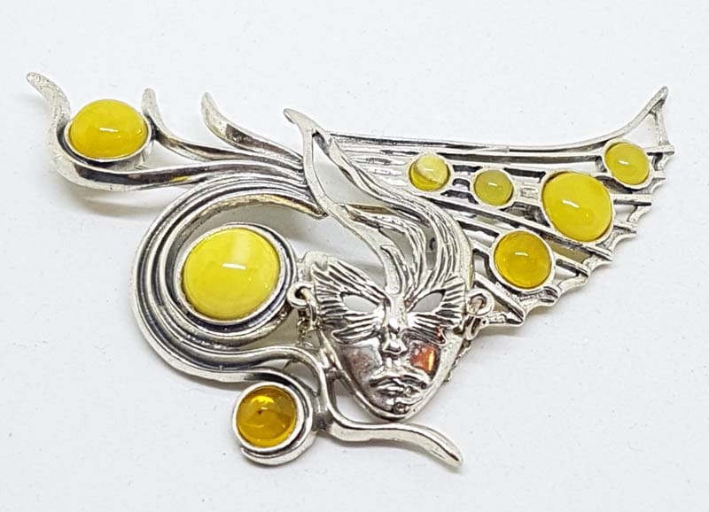 Sterling Silver Natural Butter Amber Large Mask Brooch