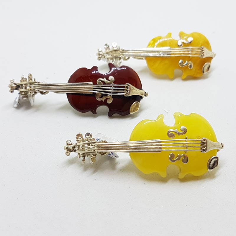 Sterling Silver Brown and Butter Natural Amber Carved Violin Brooches/Pendants – Sold Separately