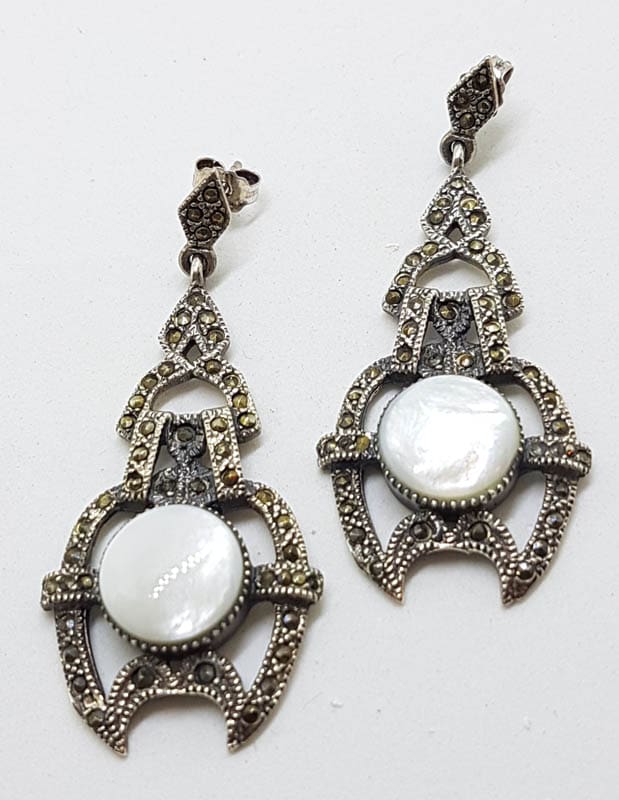 Sterling Silver Marcasite & Mother of Pearl Large Ornate Art Deco Style Drop Earrings