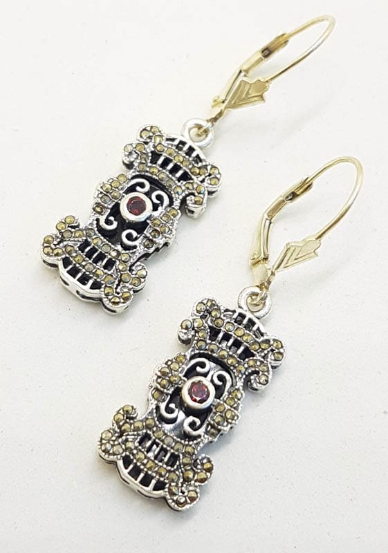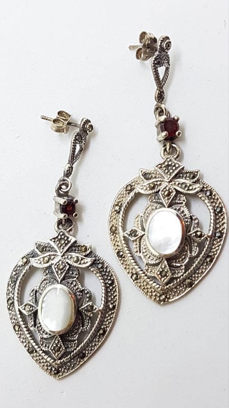 Sterling Silver Marcasite, Garnet & Mother of Pearl Large Ornate Drop Earrings