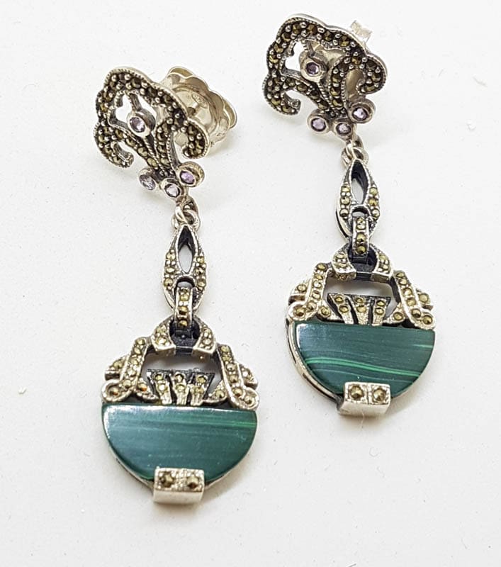 Sterling Silver Marcasite, Amethyst & Malachite Long Art Deco Style Drop Earrings