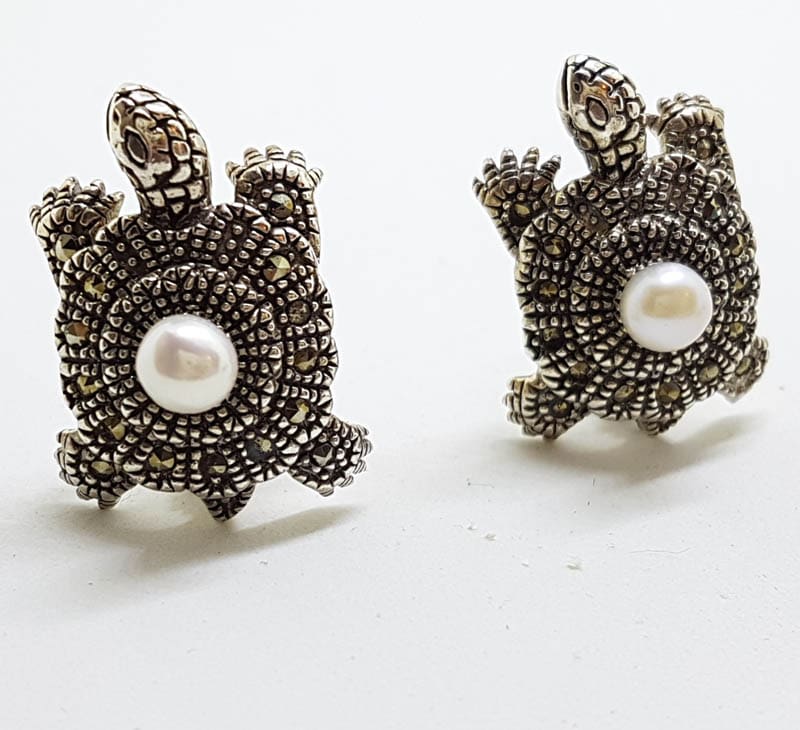 Sterling Silver Marcasite & Pearl Large Turtle Stud Earrings