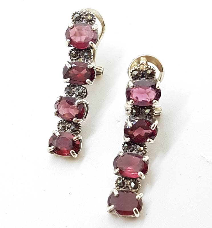 Sterling Silver Marcasite & Garnet Long Drop Earrings