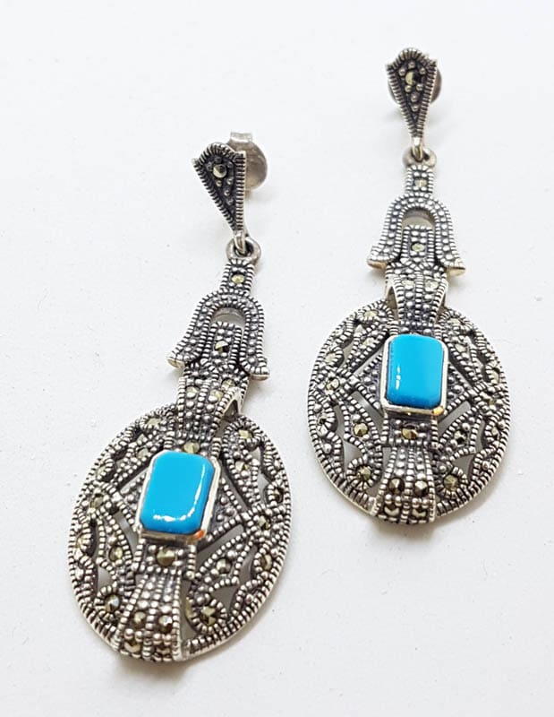 Sterling Silver Marcasite Long Drop Earrings with Reconstituted Turquoise
