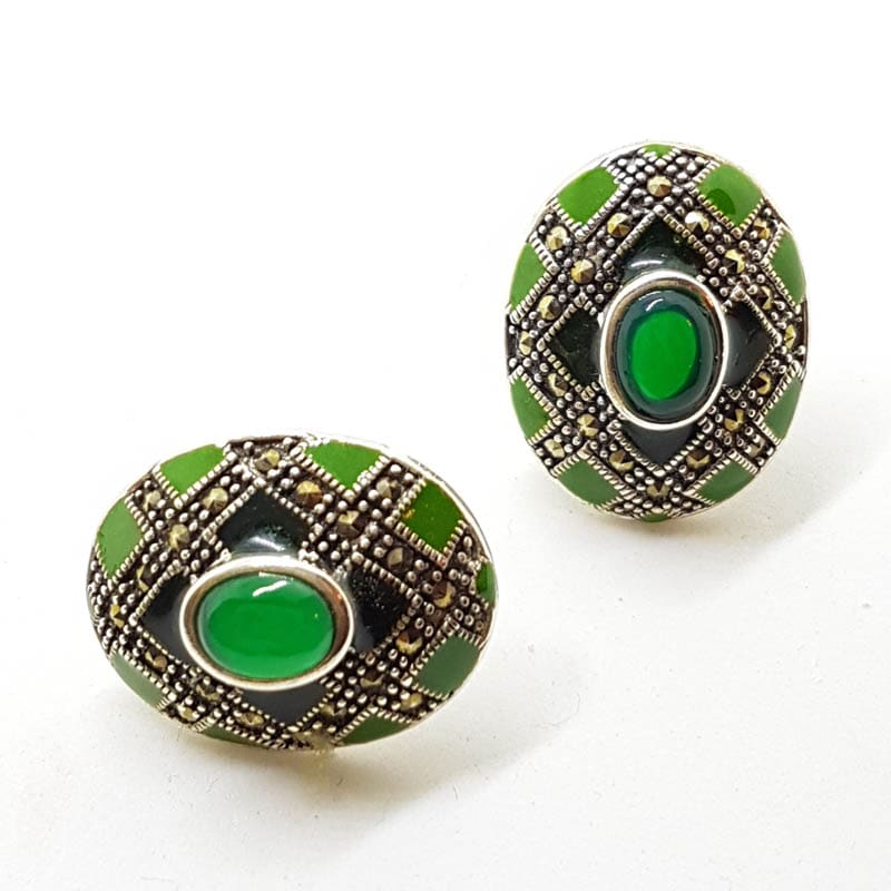 Sterling Silver Marcasite, Green Onyx & Enamel Large Oval Stud Earrings