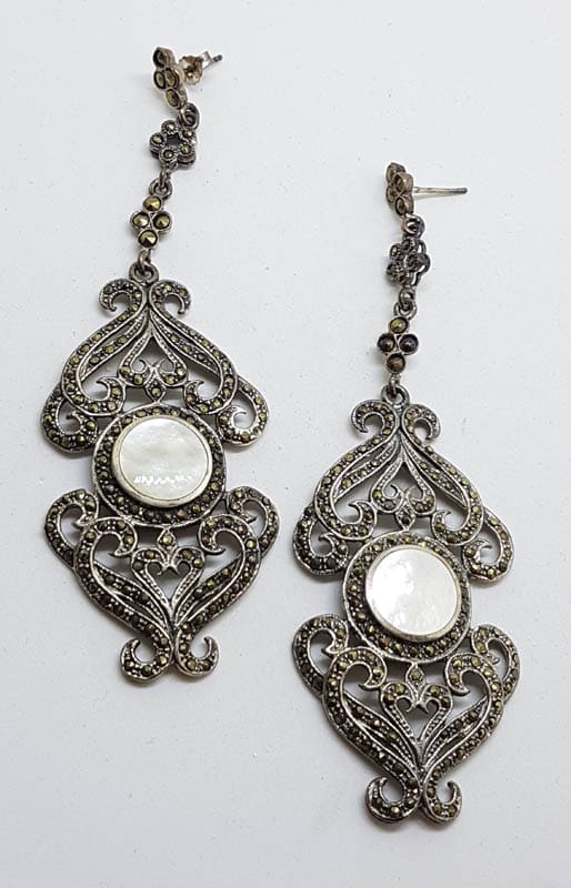 Sterling Silver Marcasite & Mother of Pearl Very Large & Long Ornate Drop Earrings