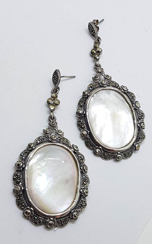 Sterling Silver Marcasite & Mother of Pearl Large & Long Oval Drop Earrings