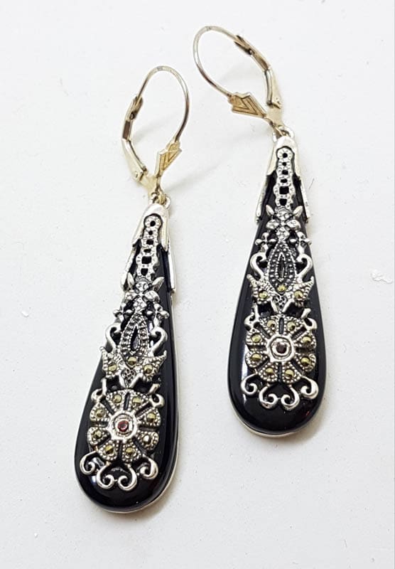Sterling Silver Marcasite, Onyx and Garnet Long Ornate Drop Earrings