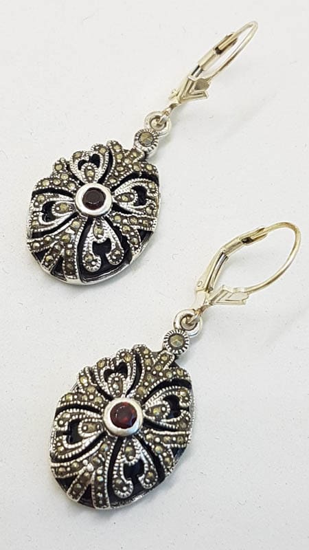 Sterling Silver Marcasite, Onyx and Garnet Ornate Oval Drop Earrings