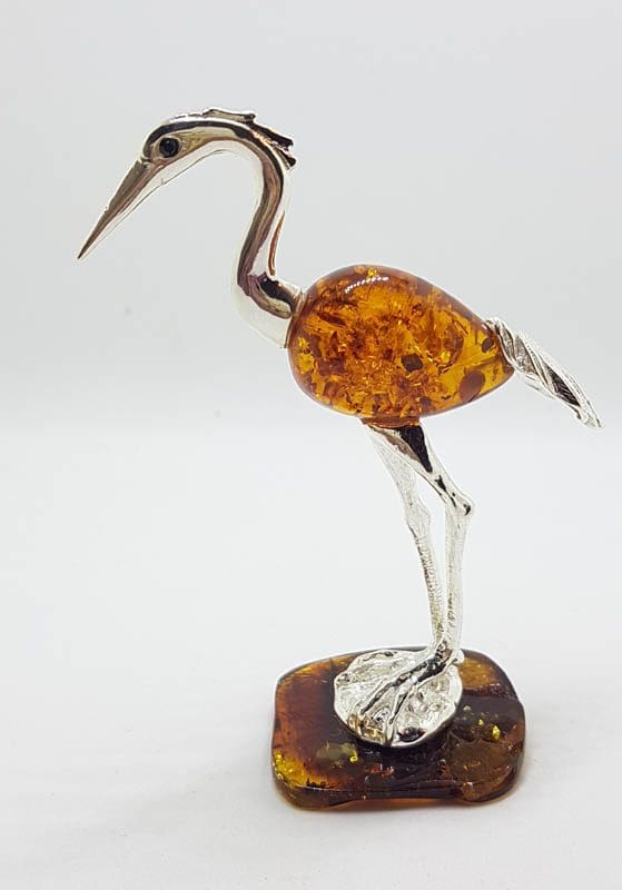 Tall Crane / Heron / Egret / Bird – Solid Sterling Silver Natural Baltic Amber Animal Figurine / Statue / Sculpture