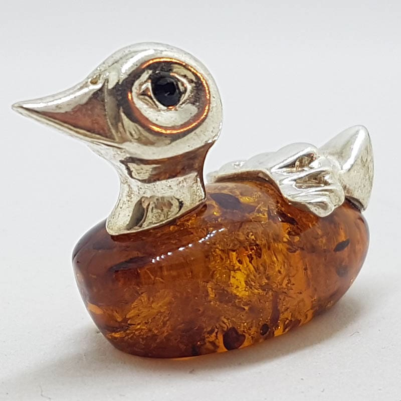 Duck – Solid Sterling Silver Natural Baltic Amber Small Animal Figurine / Statue / Sculpture