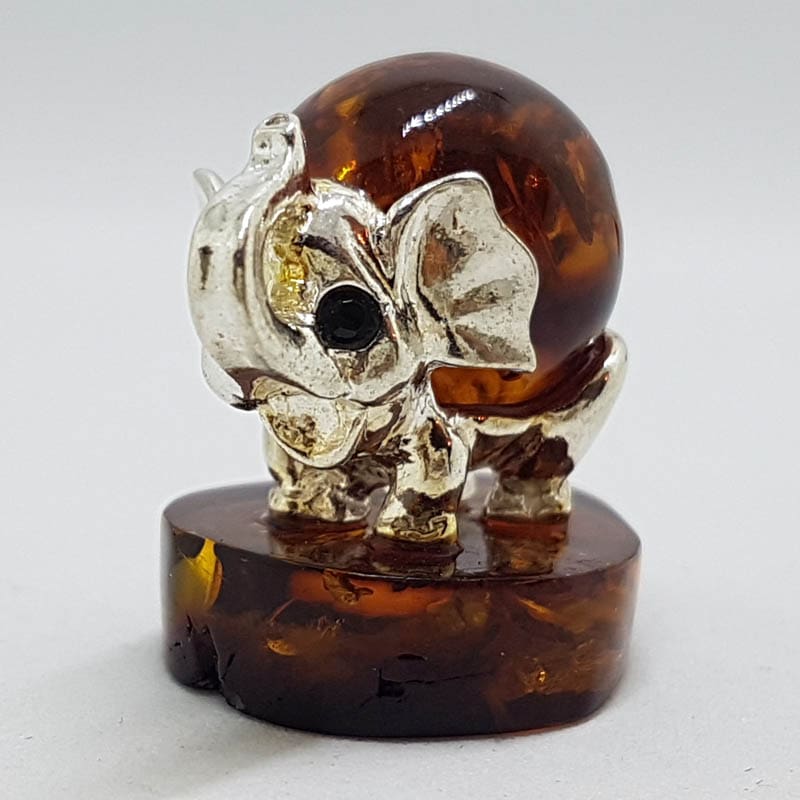 Elephant – Solid Sterling Silver Natural Baltic Amber Small Animal Figurine / Statue / Sculpture