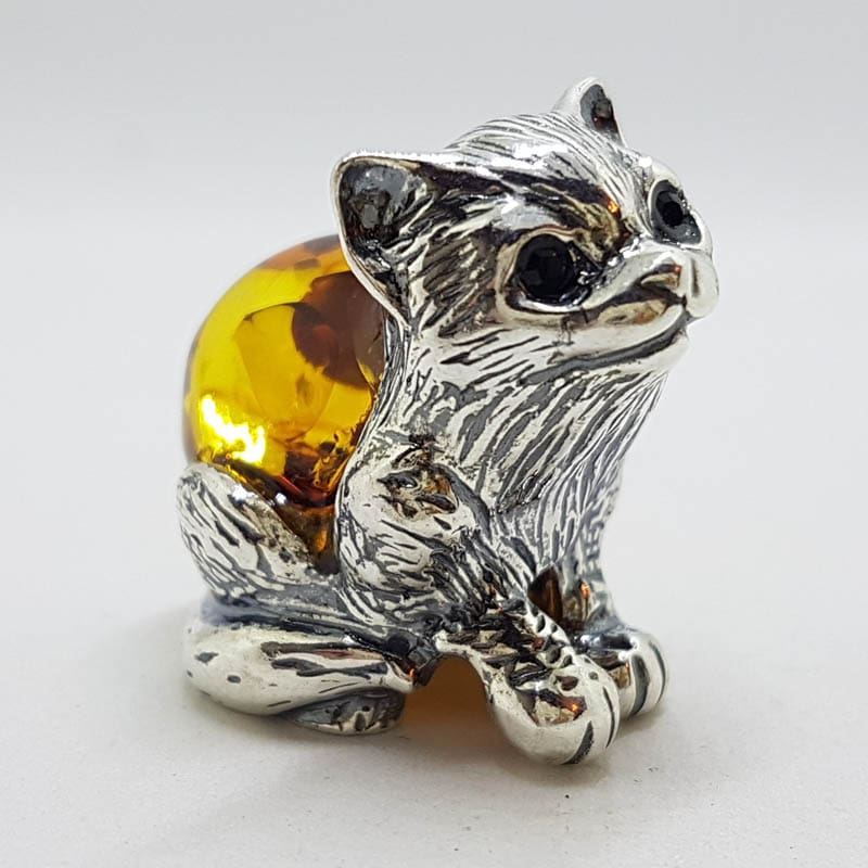Sitting Cat / Kitten – Sterling Silver Natural Baltic Amber Animal Figurine / Statue / Sculpture