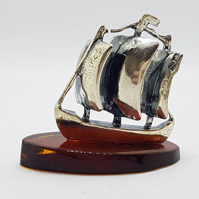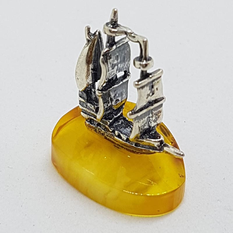 Sailing / Viking Ship / Boat / Yacht – Solid Sterling Silver Natural Baltic Amber Small Figurine / Statue / Sculpture