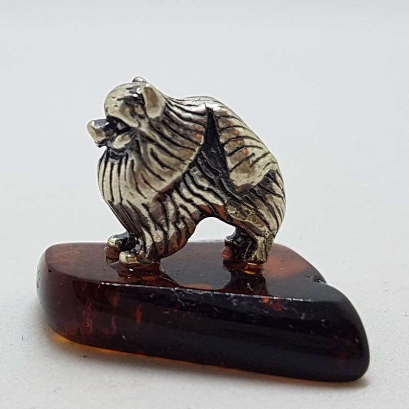 Pekinese / Pomeranian Dog – Solid Sterling Silver Natural Baltic Amber Small Animal Figurine / Statue / Sculpture