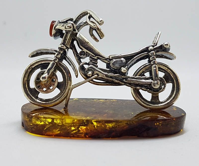Harley Davidson Motorcycle / Motorbike – Solid Sterling Silver Natural Baltic Amber Figurine / Statue / Sculpture
