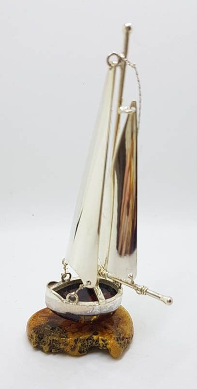 Tall Sailing Ship / Boat / Yacht – Solid Sterling Silver Natural Baltic Amber Figurine / Statue / Sculpture