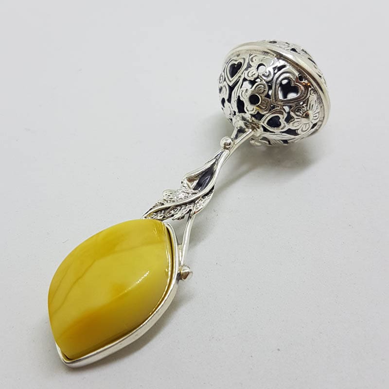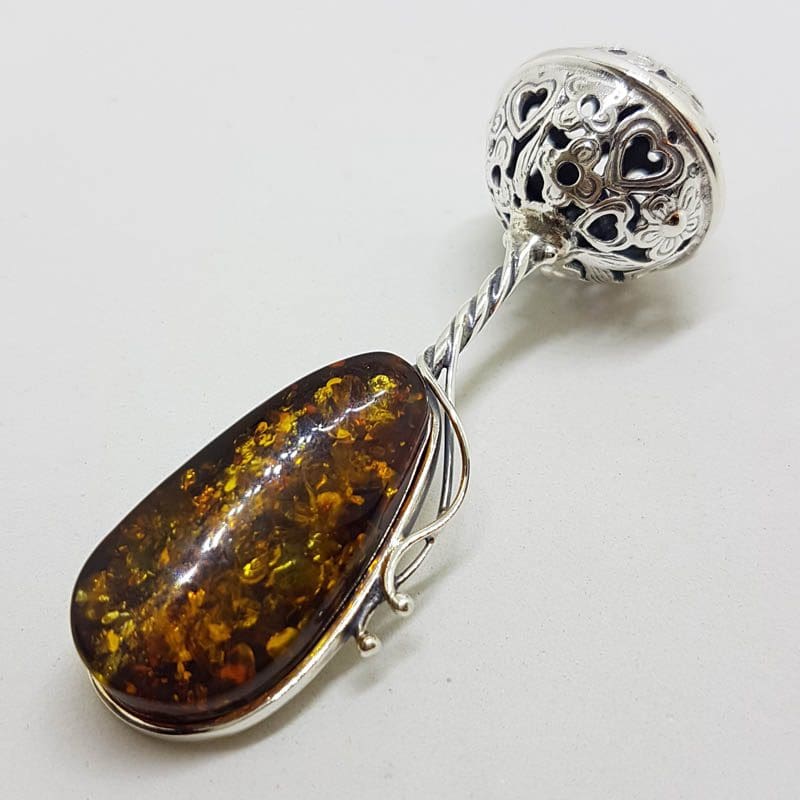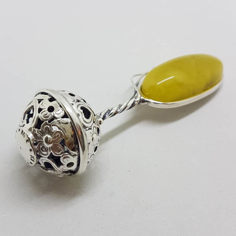 Solid Sterling Silver Baby Rattle Natural Baltic Amber – Engravable – Ornate