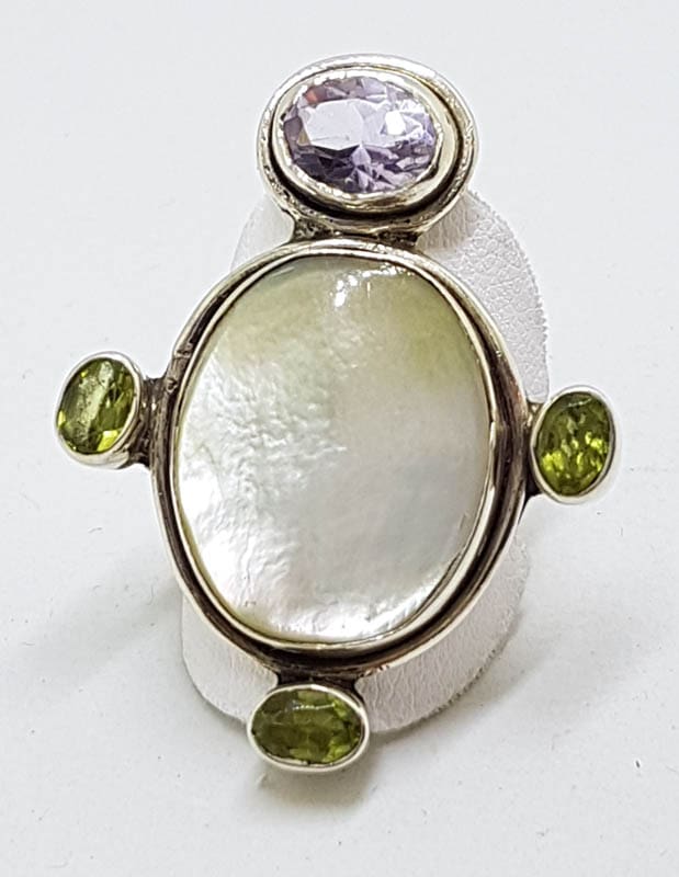 Sterling Silver Large Mother of Pearl with Amethyst and Peridot Ring