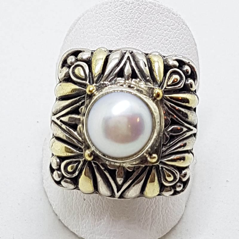 Sterling Silver & Gold Plated Pearl Ornate Square Ring