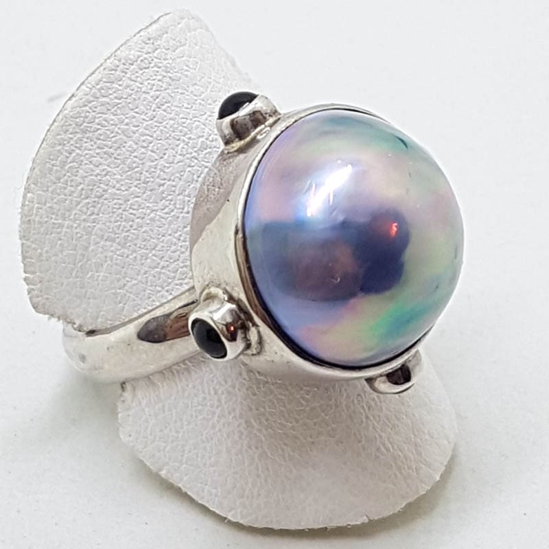 Sterling Silver Blue/Grey Mabe Pearl with Onyx Ring