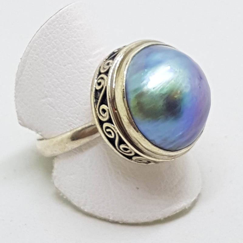 Sterling Silver Blue/Grey Mabe Pearl Ornate Rim Ring