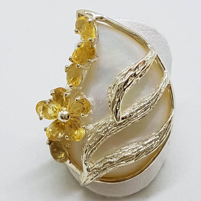 Sterling Silver Large Mother of Pearl and Citrine Leaf Russian Design Ring